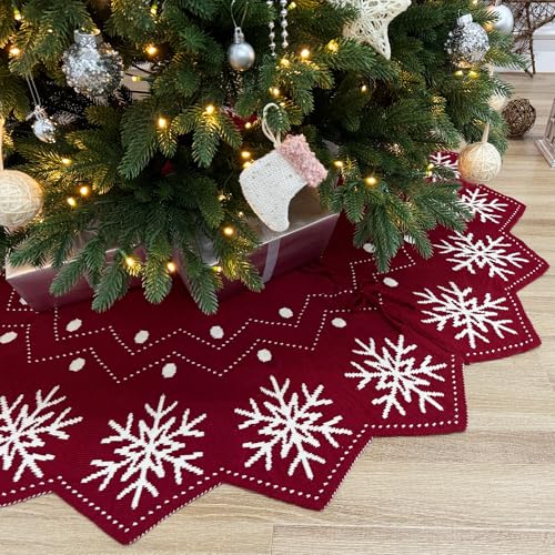 60-Inch Wavy Edged Reversible Knit Christmas Tree Skirt: Burgundy & White Snowflake Pattern with Lace Ties