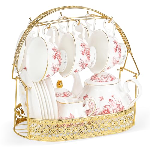 fanquare Vintage Porcelain Tea Set with Holder, 22 Piece Red Floral New Bone China Tea Coffee Gift Sets for Wedding Birthday, 6 Tea Cup and Saucers for Women Tea Party