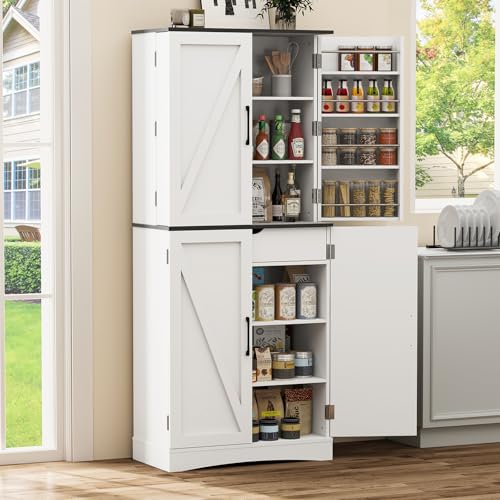 72" Tall Kitchen Pantry, Freestanding Storage Cabinet Farmhouse Rustic Wood Cupboard with Barn Doors, Organizer, Drawer and Adjustable Shelves for Living Room, Dining Room