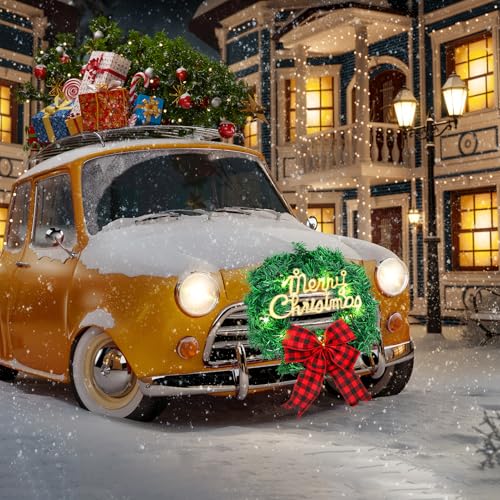 11.8″ Christmas Car Wreath,Lighted Xmas Decoration for Car Front Grill,12V Plug-in Christmas Lighting Wreath with Bow for Trucks SUVs RVs