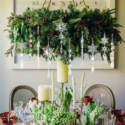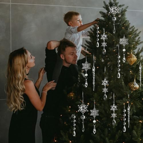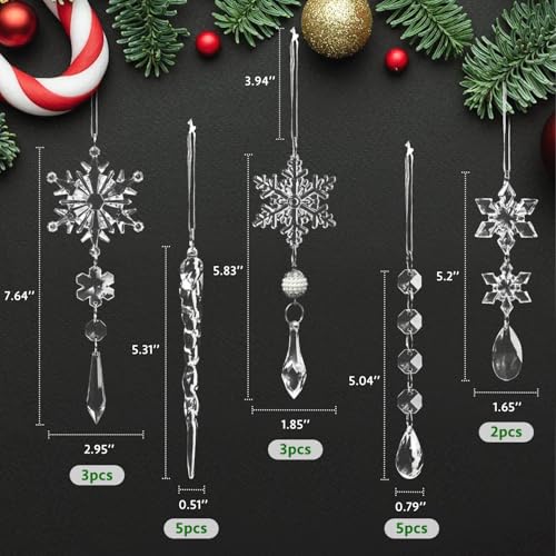 ❄️Package: Each and every set includes five unique snowflake patterns for a total of 18pcs, meticulously designed to capture the delicate and intricate great thing about real snowflakes.8 pcs snowflake ornaments (2 of 5.2″, 3 of 5.8″ and 3 of 7.64″),5pcs 5.3″ crystal icicle ornaments and 5pcs 5″ beaded garland decrotion.
