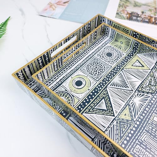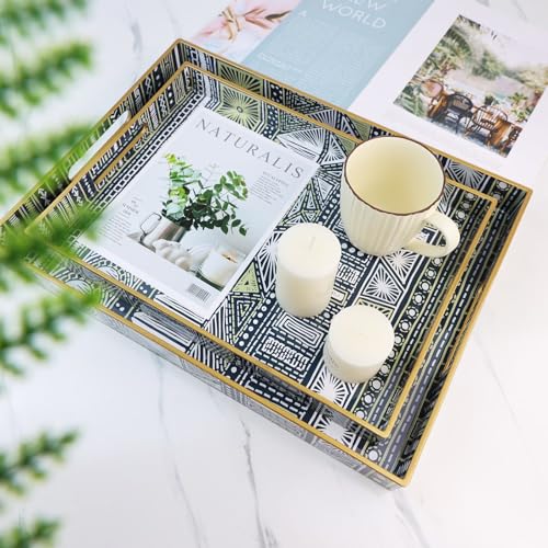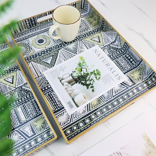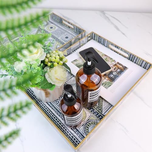 • 2 Pack Boho Decorative Trays with Handles Modern Serving Trays for Coffee Table Living Room Kitchen Home Decor Black