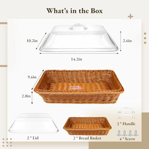【Large-Capacity Bread Basket】You are going to receive 2 large-capacity rattan-style bread baskets, each measuring about 14.2″x10.2″x2.6″, complete with 2 crystal-clear acrylic lids, 2 portable handles, and 4 screws. This set provides an elegant storage solution that blends functionality with style.