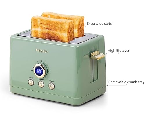 AMASTE TOASTER BLENDS RETRO AND MODERN STYLES. With Retro-style and trendy color options, the 2 slice toaster adds pizazz to any kitchen. If you’ve got a amaste retro coffee maker in your house, this tow-slot toaster will match beautifully. The modern LED digital countdown timer is a helpful, user-friendly function, it’s going to show your selected toast settings and the toasting progress. The high lift lever will pop up automatically after the toast is done, which can help you easily take the bread.