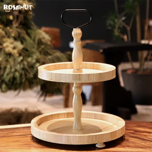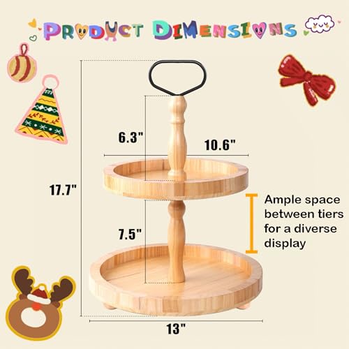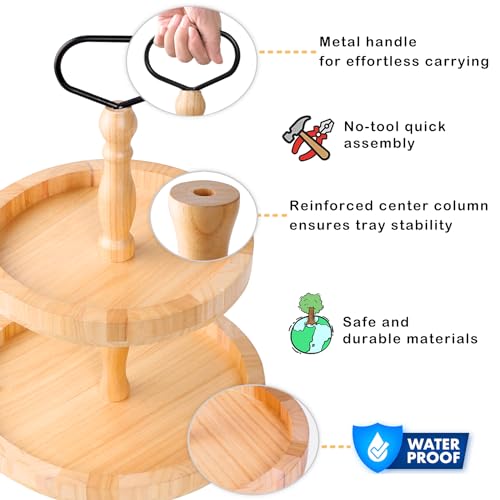 • 2 Tiered Tray Rustic Round Farmhouse Style Decorative Tray Dessert Stand Kitchen Island Decor Wooden Serving Tray for Coffee Food Fruits Cupcakes Home Decor Holiday Display Natural Wood