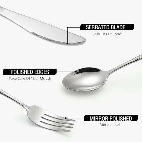 【High Quality Stainless Steel】This flatware set is made of top quality stainless steel, which is a sturdy material and easy to clean. It is mirror polished to give the set a glossy look and the edges of the silverware are polished smooth for a comfortable grip when in use.