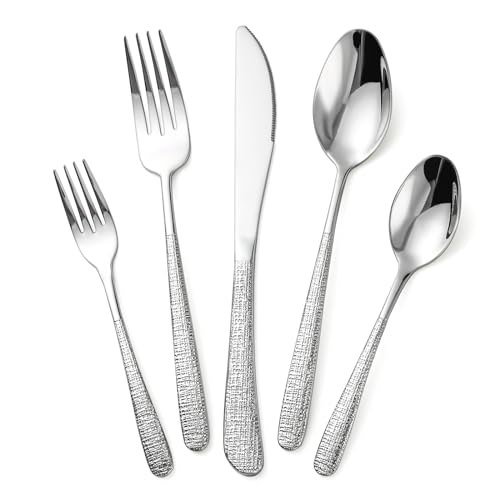 - This silverware set is simple and generous in style, the hammered handles add a vintage element to the in a different way simple flatware, simple and vintage flatware will also be matched with most styles of tableware.