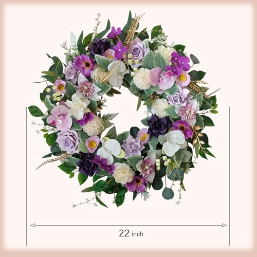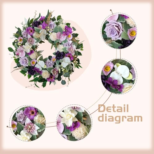 【Elegant Spring Wreath】A combination of more than a few flowers, each detail carefully selected and matched. The overall color scheme is white and purple, featuring numerous flowers such as roses, orchid, gardenia, and dahlias, with colors ranging from light to dark purple. Several types of leaves and berry branches are interspersed, creating a magical combination that is breathtaking and invites close statement of its beauty.