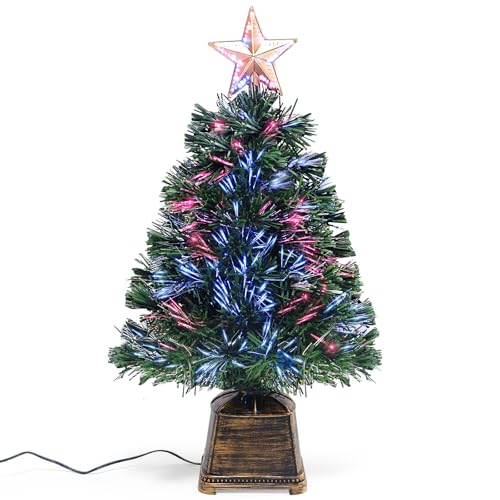 24in Tall Fiber Optic Tree: standing 24in tall, this tabletop xmas tree with lights 2 feet serves as the point of interest of any room with pre-programmed fiber optic lights and 55 branch tips, There’s a button under the base to keep an eye on the fiber optic lights on and off,it’ll be your holiday tree for future years