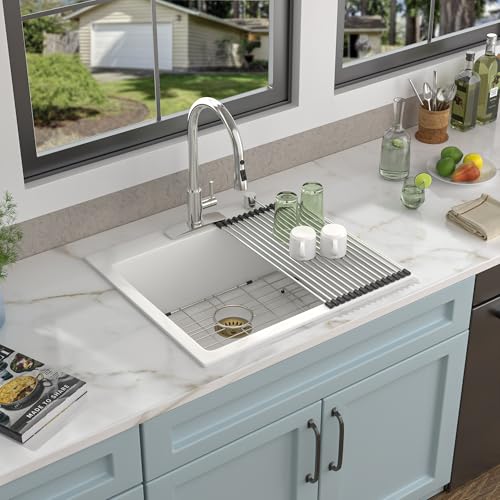 〓 Sink Set/Installation – Complete package includes a 25 inch white granite composite kitchen sink, a roll up drying rack, a bottom rinse grid, a drain assembly and more.|Cutout Size: 24.2″(width) x 21.2″(depth)|Minimum Cabinet Size: 28 inch. Reserved 2 holes for soap dispenser or water purifier faucet. Easy to install topmount granite sink drop in. | If any concerns or questions, please get in touch with us, We’re at all times able that can assist you – Fulorni Service.