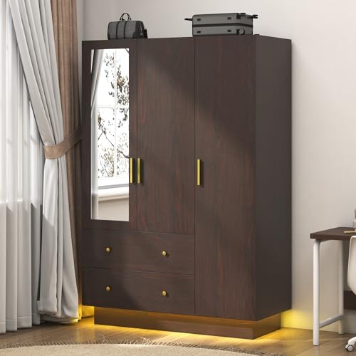 Farmhouse Fashion Appeal】Unlike most wardrobes, our up to date farmhouse wardrobe comes with a mirror. This oversized mirror will give you a full view of yourself. The brown wardrobe closet with golden handles and the retracted design of the bottom base show an elegant and noble charm with numerous house decors