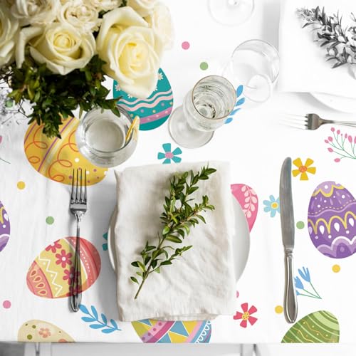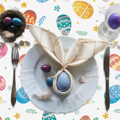 EASTER THEMED DESIGNS: The Easter tablecloth features vibrantly patterned Easter eggs in more than a few colors and designs, including stripes, polka dots, and floral patterns. Scattered between the eggs are small flowers, leaves, and other cheerful springtime motifs, adding to the celebratory atmosphere. This tablecloth is perfect for Easter gatherings, spring parties, or festive brunches, bringing a full of life and joyful touch to your table setting