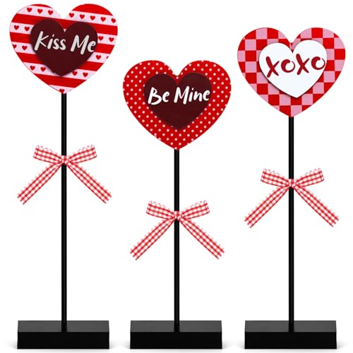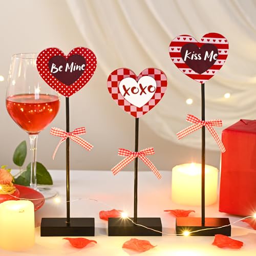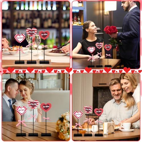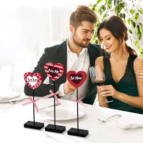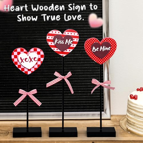 CHIC VALENTINES DAY DECORATIONS: Adorn your space with elegance this Valentine’s Day with our set of 3 double-printed, heart-shaped wooden signs. Featuring a stylish black and red motif, complete with checkered ribbon bows, these pieces are the epitome of romance with a up to date twist.