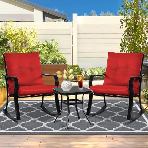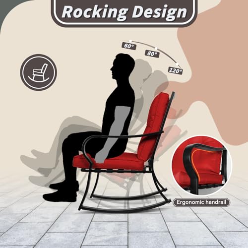 🔥【Soft and Comfortable Cushion】: The 3 Piece outdoor rocking chairs come with thick sponge filled cushions which are made of premium waterproof olefin fabric. Removable cushion covers are easy to clean. Less maintenance, but more comfort.