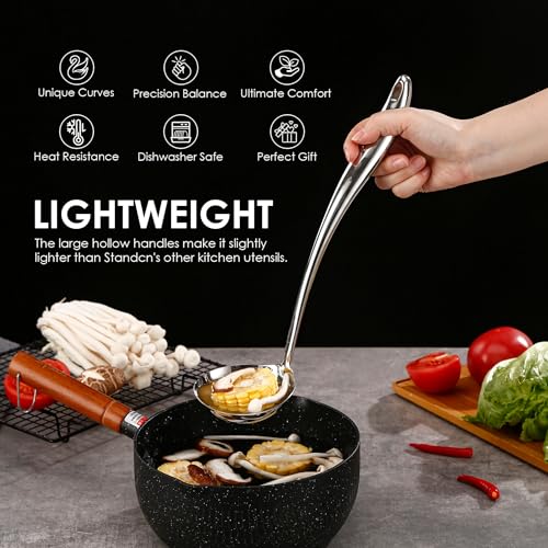 15inch lightweight cooking spoons, ergonomic design, precise balance, excellent grip, long take care of to provide high heat resistant, make sure the chef’s hands stay cool(The large hollow handles make it rather lighter than Standcn’s other utensils)