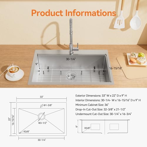 𝐒𝐩𝐞𝐜𝐢𝐟𝐢𝐜𝐚𝐭𝐢𝐨𝐧𝐬: Sink size: 33″ L x 22″ W x 9″ D; Internal size: 30-1/4″ L x 16-15/16″ W x 9″ D; Package includes: Faucet x 1, Sink x 1, Basket Strainer x 1, Grid x 1
