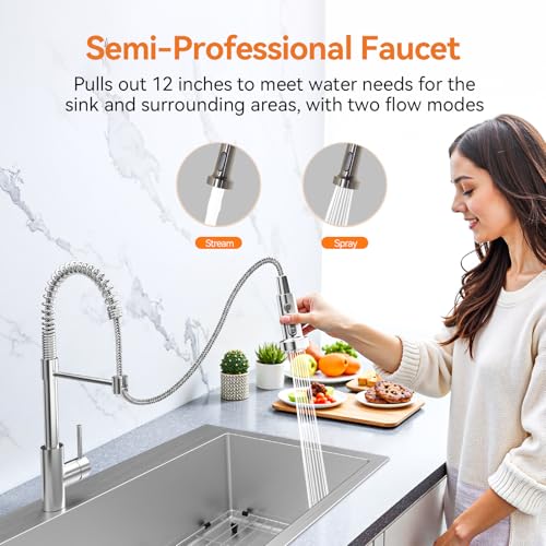 𝗦𝗲𝗺𝗶 𝗣𝗿𝗼𝗳𝗲𝘀𝘀𝗶𝗼𝗻𝗮𝗹 𝗙𝗮𝘂𝗰𝗲𝘁: Designed with a 360° swivel spout, it allows for simple maneuvering around the sink, providing full range coverage for your whole kitchen tasks. The faucet also features dual-function nozzles, which allow you to effortlessly switch between a powerful stream for filling pots and a spray mode for rinsing dishes, ensuring you’ll be able to tackle the whole thing from food prep to cleanup easily and efficiently