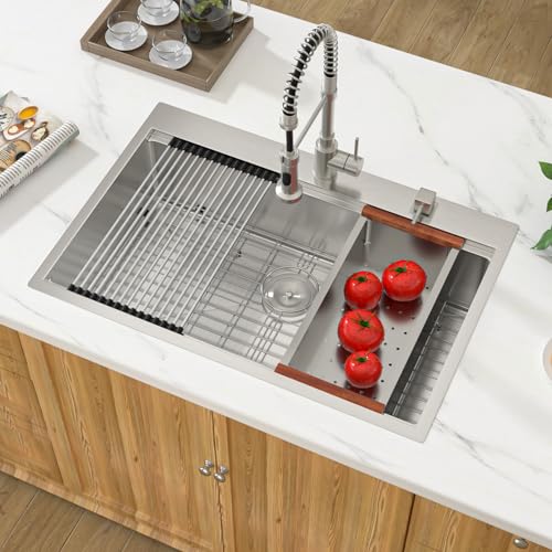 HEAVY-DUTY 16-GAUGE STAINLESS STEEL ––Made of premium heavy-duty TRU 16 Gauge T304 stainless steel, the drop kitchen sink is highly resistant to dents and scratches, corrosion resistant. Commercial grade brushed finish, easy to clean and take care of, matches most kitchen appliances.