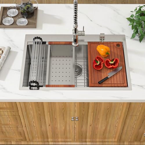 MULTIFUNCTIONAL WORKSTATION SINK––36″ large bowl stainless kitchen sink is designed with single-tier track for saving space, including solid wood cutting board, colander and roll-up drying rack that slide flexibly at the front and rear overhanging ledges, converting the drop sink into a multifunctional workstation.
