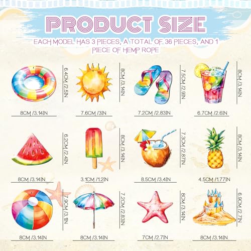 Summer Hanging Ornaments Set: You are going to receive totally 37 pieces in a package,which come with 36 pieces ornaments,12 unique styles and a bundle of twine that you’ll hang the Summer Ornaments