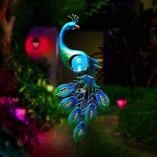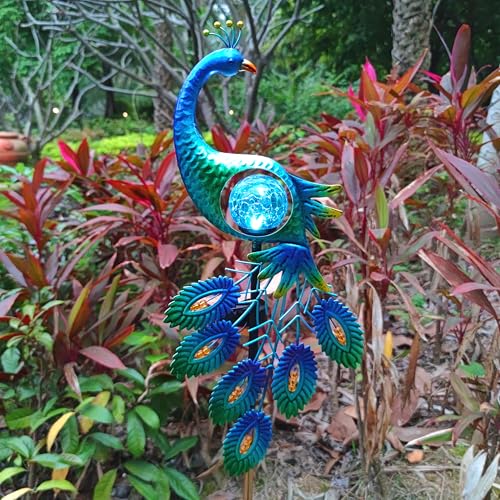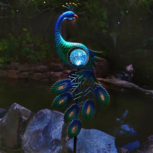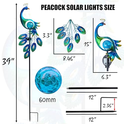 • 39 Inch Metal Peacock Solar Lights Garden Stake for Outdoor Decorative with Crackle Glass Ball Waterproof Solar LightLandscape LED Path Lights for Yard Garden Lawn Outside DecorationBlue