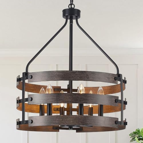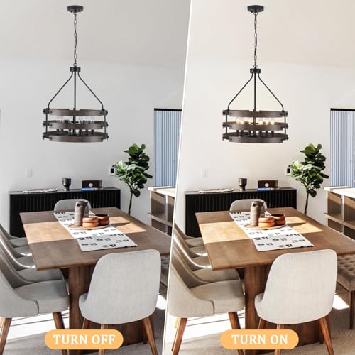 Rustic Charm: This farmhouse chandelier has a three-layer frame in imitation wood grain color and a black metal structure base pendant,this chandelier forms a unique and artistic farmhouse light fixtures with stable structure and durability, adding warmth and rustic charm to your home decor whilst lighting.