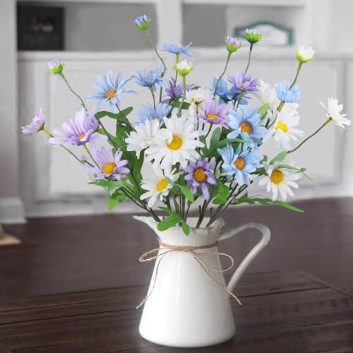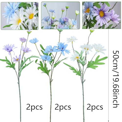 There are a total of 6 beautiful artificial daisy flowers with stems, available in 3 bright colors: blue, white, and purple. Each color has 2 bundles, providing sufficient quantity and color diversity for your decoration needs.