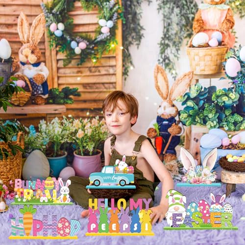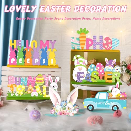 • 6 Pcs Easter Spring Tabletop Decorations Easter Table Decor Tiered Tray Decorations Set Happy Bunny Egg Truck Wooden Signs Gnome Rustic Table Centerpiece for Home Spring PartyBunny