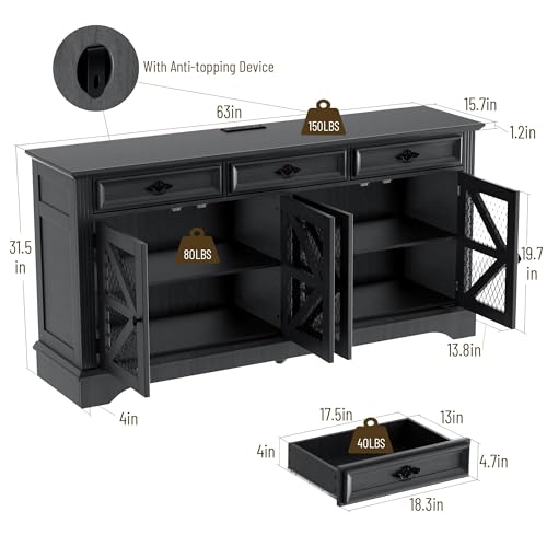DURABLE AND RELIABLE: Constructed with premium engineered wood and strengthened with reinforced wooden bottoms, this large sideboard cabinet offers outstanding stability and long-lasting durability, designed to endure day-to-day use. Its dimensions are 15.75 inches deep, 63 inches wide, and 31.5 inches high, with a weight capacity of up to 330 pounds