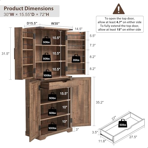 Discover Versatile Storage Solutions: Unleash the opportunity of your space with our storage cabinent, generously sized at 30″W × 16″D × 72″H. Tailor your storage needs with 6 shelves (4 adjustable), 8 door shelves (2 adjustable), and a smooth-gliding middle drawer. Beyond organizing your kitchen essentials, this cabinet effortlessly transitions to accommodate bathroom necessities and support living room aesthetics. Elevate every corner of your home with impeccable organization.