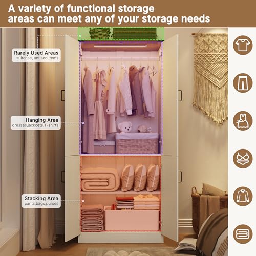 LED Wardrobe Closet:this 75″ wooden wardrobe closet for bedroom Equipped with human body intelligent induction light, the door light turns on when opened and turns off when it is closed the door. The induction range is within 5 meters, so you’ll easily find clothes at night. And our induction light is equipped with a USB charging cable, which only must be charged 4 times a year for use often,Make your home full of warm atmosphere.