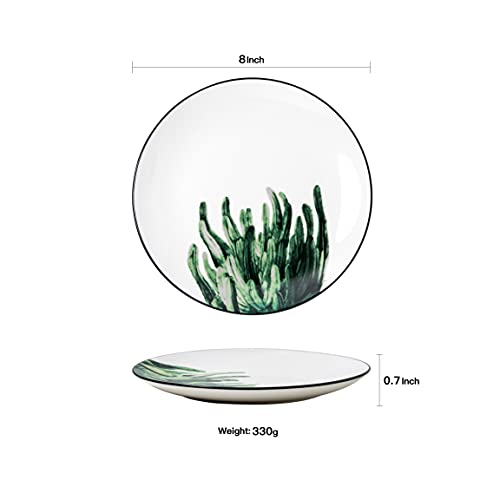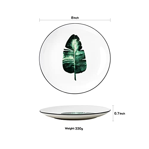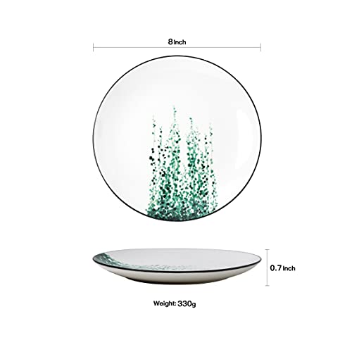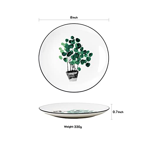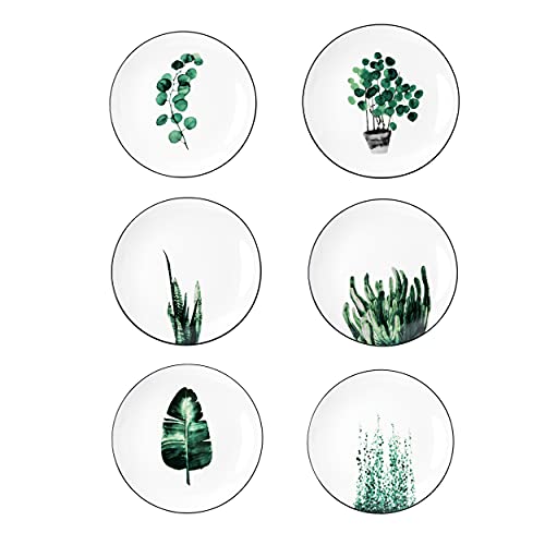 YCBH 8 Inch Set of 6 Assorted Designs, Small Porcelain Plates with Plants Pattern,Ceramic Dinnerware for Appetizer Luncheon Snacks Dessert Serving Bread, Microwave Oven Dishwasher Protected, White SPECIFICATION:1. Material: Porcelain/Ceramic2. Color: White3. Shape: Round4. Dimensions: 8x8x1 inches5. Occasion: All Occasion 6. Weight: About 346g FEATURES:1. These plates are made by prime quality ceramic clay ,It is time to complete your dinnerware collections.2. AB-grade porcelain for on a regular basis use; lightweight yet durable.3. Stylish and classic shape, sleek surface, simple but elegant.4. Smooth, tightly glazed surfaces are free of food residue and odors. Just put them in dishwasher or water, it’s easy to clean.5. Microwave, oven, freezer and dishwasher Protected. Sturdy, easy hand-holding, Protected for the old and kids to use.6. These plates set are stackable and don’t take up cabinet space. Flat design makes them easily stack on each other, no matter how many pieces you buy, You’ll stack them together to save cupboard space without toppling risk.NOTE:1. Please allow 1-2mm error Because of manual measurement.2. Because of the difference between different monitors, the picture may not reflect the actual color of the item.3. After these dinner plates is fired, the glaze is smooth, with unique patterns, each one is unique. Sleek and round shape design are stylish and elegant, perfect for daily use, dining room and other occasion..QUALITY SERVICE:We are online 24 hours, when you have any questions, if the products are damaged,please contact us for replacement as soon as imaginable, we can solve all problems for you.PACKAGE INCLUDED:6 pcs of set,Meet the needs of kinds occasions