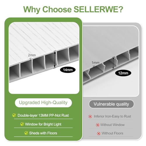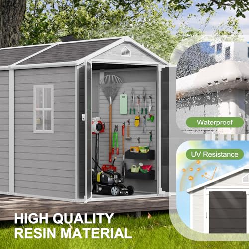 【PREMIUM MATERIAL STORAGE SHED WITH FLOOR】: The 14mm tough double-wall resin construction, 0.6 mm galvanized steel frame and affect-resistant floor are designed for long-term durability. The double-wall panels are waterproof and moisture-proof, allowing worry-free use in all weather conditions. It is weather-resistant, waterproof, and UV-resistant-no peeling, rotting, or rusting. The screws are embedded to make sure aesthetics and safety