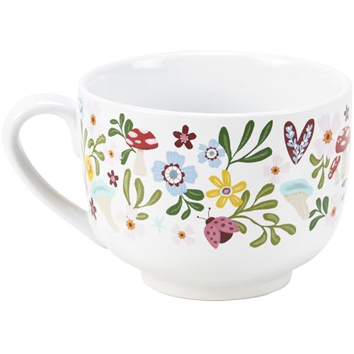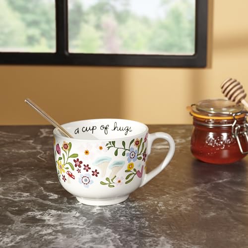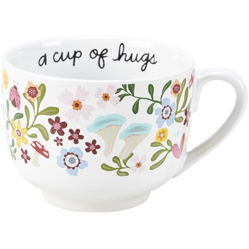 A stoneware 20 ouncesmug from our Inspiration & Blooms Collection displaying an entire wrap-around design of colourful hand illustrated flowers, hearts, and ladybugs. Mug also features an inside of design with inspirational sentiment along the rim that reads “A Cup Of Hugs” and multi-color flowers on the bottom. Our A Cup Of Hugs mug is microwave, oven, dishwasher, and food protected. An inspirational mug highest for on a regular basis drinkware.