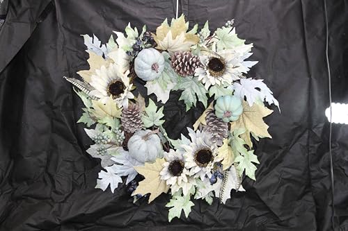Beautiful 24-inch classy fall decor rustic farmhouse wreaths for front door are a combination of velvet pumpkins, cream sunflowers, maple rustic leaves, berries, feathers, and pinecone is eye-catching handmade fall sunflower wreath will impress your visitors and never goes out of style. The fall door wreath looks like real foliage with a vivid appearance. Simply gorgeous and elegant! this fall wreath front door is uplifting and is perfect for fall autumn, halloween, Thanksgiving or holiday creating a romantic fall joy and its seasonal style for a home place of job or farmhouse. A perfect accent piece for fall decor for door, fall decorations porch, window, home, wall, fireplace mantel decor, and place of job fall door decoration. Also as a gift for your friends and family. Advisable for indoor use, but it is imaginable to display the autumn wreaths for front door outside with covered outside locations. Size 24 inch L x 24 inch H x 5.5 inch D. Item comes compressed, primping and fluffing required to match the image shown. No assembly is required.