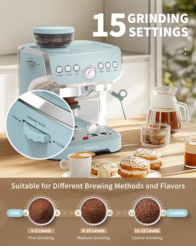 ADDS A SENSE OF CEREMONY TO COFFEE-MAKING. Amaste espresso coffee machine with grinder, boasting a unique matcha green finish, blending vintage charm with modern style. Its compact design optimizes kitchen space, beautifully complementing any decor in homes or offices. With an intuitive interface, this espresso machine ideal for both novices and coffee lovers alike, simplifying the art of espresso making for daily enjoyment.