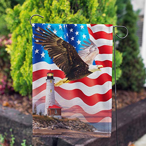 PATRIOTIC BALD EAGLE 4th OF JULY SUMMER LIGHTHOUSE GAREDN FLAG: An elegant Patriotic design shows an immense eagle holding an American flag.