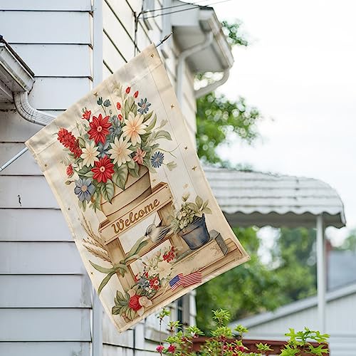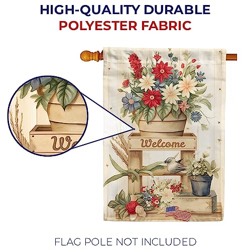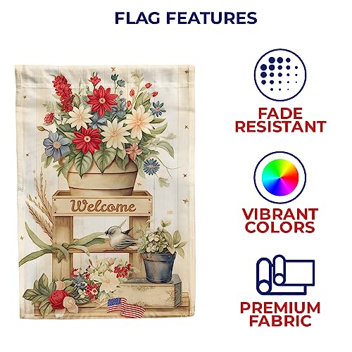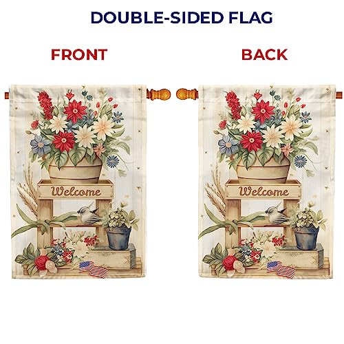 RUSTIC SUMMER HOUSE FLAG: This flag features a wooden flag stand with a big pot of red, white, and blue flowers at the top. The word “Welcome” is written at the topmost level of the stand.
