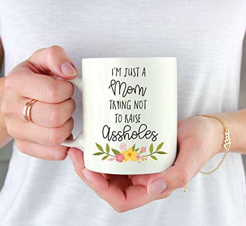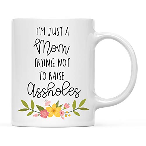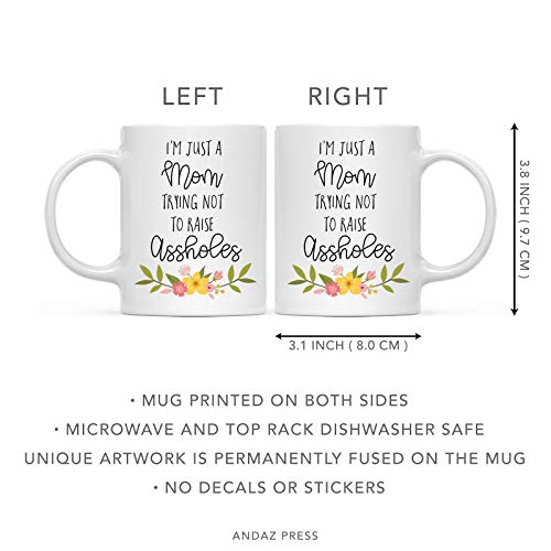 • Andaz Press Funny Mothers Day 11oz Coffee Mug Gift for Mom Im Just a Mom Trying Not to Raise Assholes 1 Pack Novelty Birthday Christmas Hot Chocolate Cup