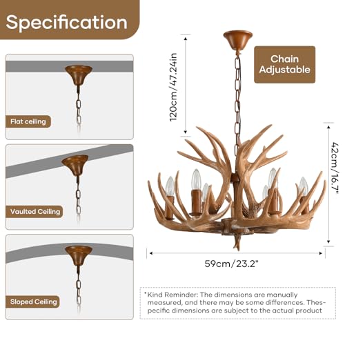 【Home Classic Antlers Chandelier】 Rustic antler chandelier has a double-layer design with 3 antlers on the upper layer and 6 lights& 6 antlers on the lower layer. Size: diameter 23.2“, high 16.7″(chain length not included), Chain 47.2″(adjustable length). And use hand-dyed unfashionable resin antlers to reach a perfect match with your home!