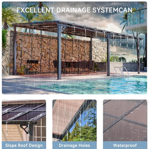 【Drainage Holes and Sloped Roof】The sloped roof design ensures rainwater flows smoothly off the eaves, preventing water accumulation issues. Also, drainage holes further make stronger water drainage for improved performance of this out of doors pergola in out of doors settings.