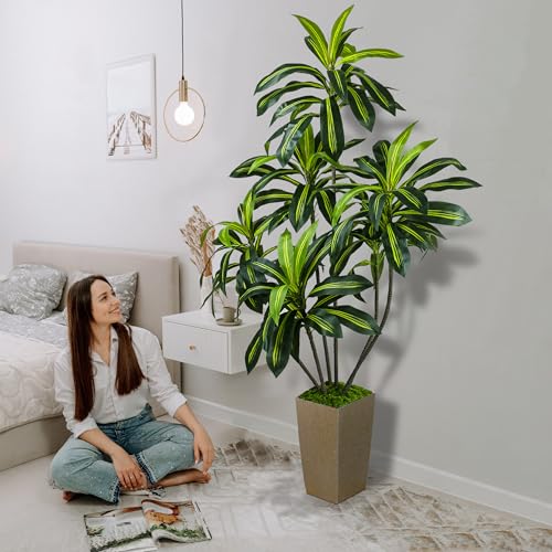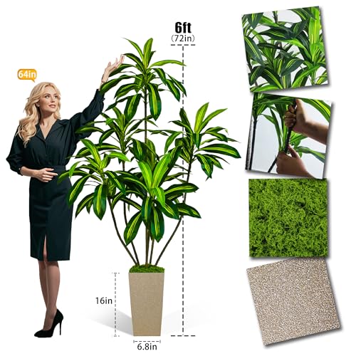 Artificial Dracaena Tree 6FT, 6 Feet Tall Fake Tree for Home Decor Indoor with Modern Style Planter, Artificial Silk Tree for Home Office Living Room Indoor, Lifelike & Lush (Champagne)