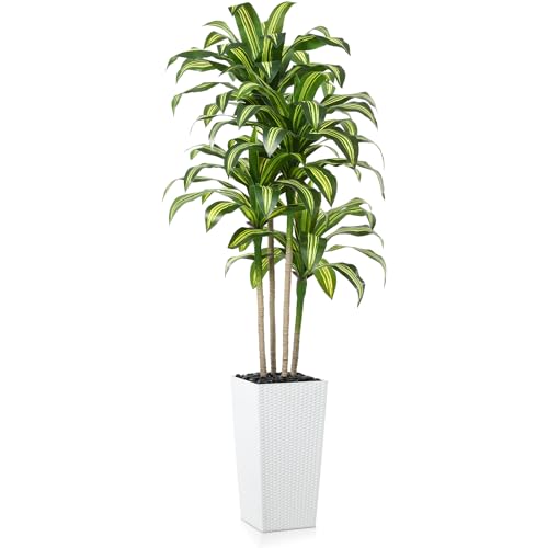 OAKRED Artificial dracaena Tree with Tall White Planter: Its elegant design suits diverse settings from brand new living rooms to ambient courtyards. With river rocks as decoration, it has a natural and artistic flavor. No need for an additional decorative planter.