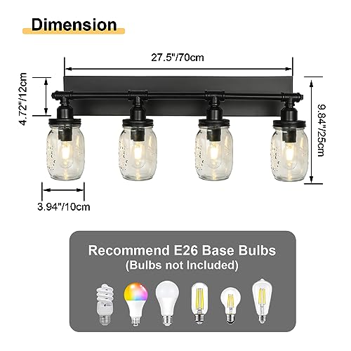【High Quality】Constructed with premium metal and glass materials, this vanity light is designed to resist the test of time and provide reliable performance for future years. Boasting 4 charming mason jars, this light fixture delivers a generous amount of implausible light and imbues your bathroom, kitchen, dressing room, vanity table, powder room, and other indoor areas with a popular rustic charm.