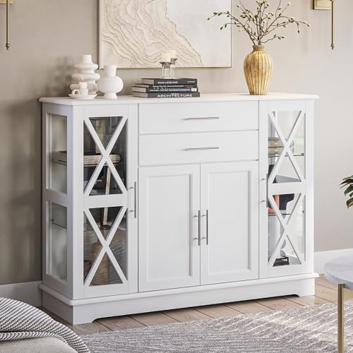 Ample Storage: Featuring two utility drawers, four slab-style cabinet doors with glass panels, and eight adjustable shelves, this cabinet offers ample storage and display options for your entire household items.