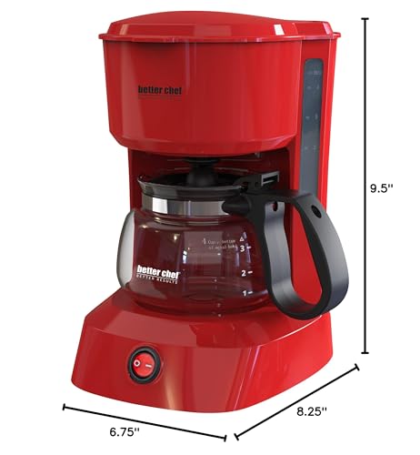 Compact Versatility: This 4-cup Better Chef drip coffee maker is highest for small households or personal use, with a 32-ounce capacity and a durable plastic construction in a vibrant red color.