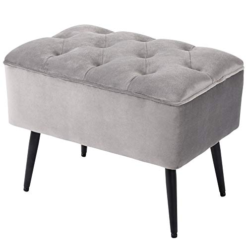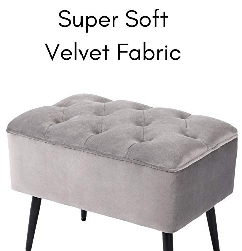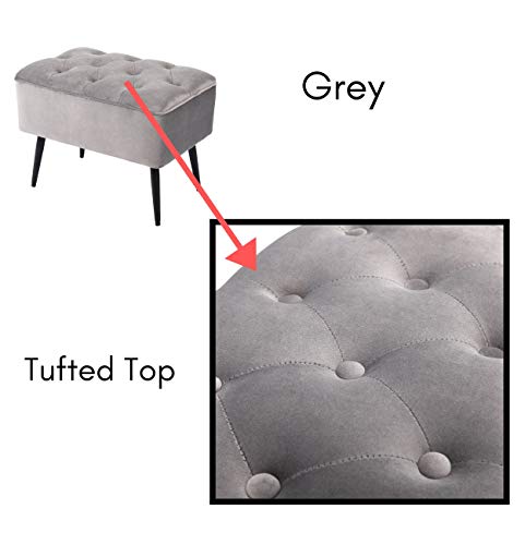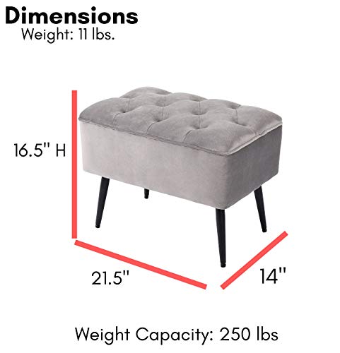 BIRDROCK HOME Tufted Rectangle Grey Ottoman – Velvet Foot Stool – Mid Century Modern Steel Legs – Soft Compact Padded Stool – Living Room or Bedroom – Vanity Chair – Decorative Furniture