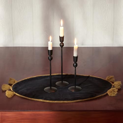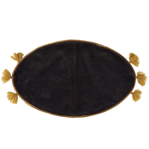 A double-sided table runner from our Halloween Assortment displaying a black velvet best and black cotton bottom with gold velvet trim and gold tassel accents. Runner can be utilized as table décor or as an accessory to a home décor show. Our Black Velvet table runner is conveniently machine-cleanable for simple cleaning. A moody Halloween home accessory with quite a few show choices.