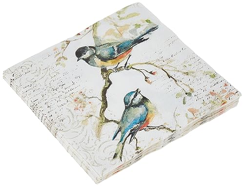 ENHANCE TABLE DECOR WITH FESTIVE NAPKINS: Creamy white napkin with watercolor style design of birds perched among subtle script and patterns