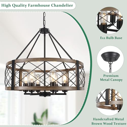 Rustic & Farmhouse Chandelier: Brown Wood Textured Finished. This charming rustic drum chandelier brings a touch of countryside elegance to any room. With its warm, inviting design and timeless appeal, it’s perfect for adding a cozy, vintage feel to your home decor